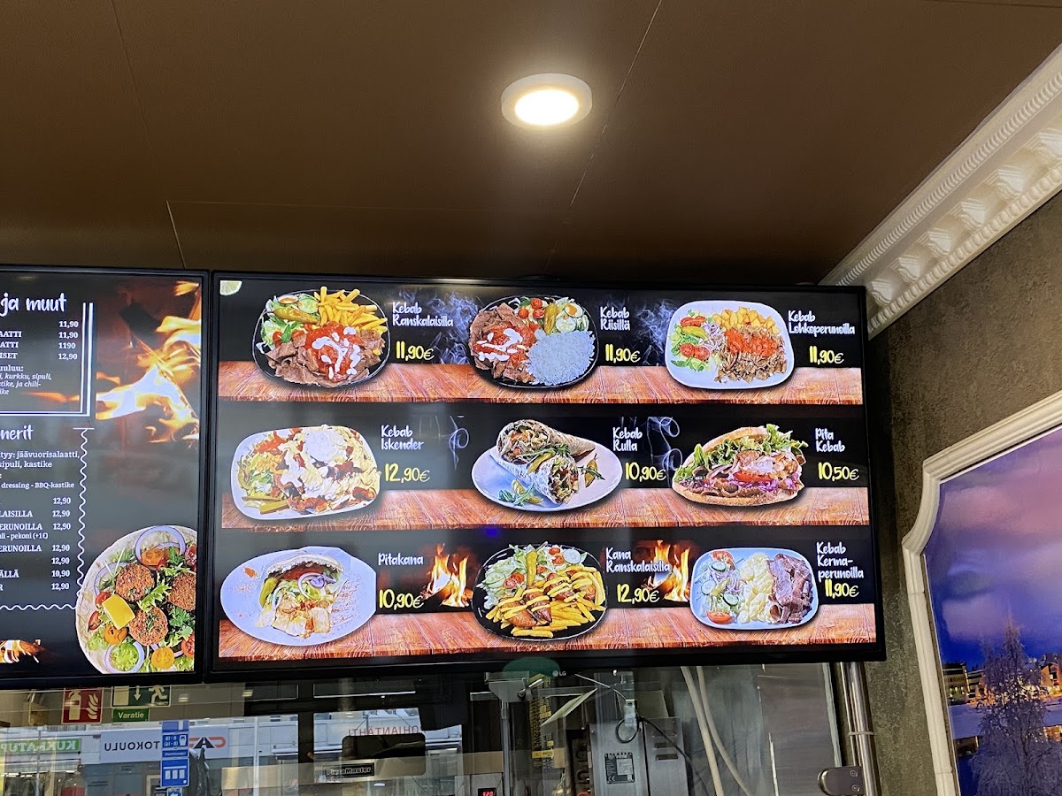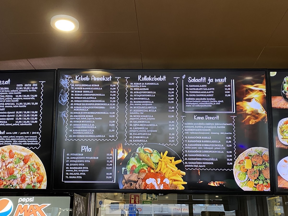 Pizza lovers get multiple sizing routes (Norm., Jätti, Perhe) and familiar crowd-pleasers like Fantasy 4 and Kebab Pizza, which fit the overall “big flavors, big portions” vibe. On the lighter side, the salads-Kebabsalaatti, Katkarapusalaatti, KanasalaattiTonnikalasalaatti-give some welcome variety, especially if you’re balancing out the richer mains. The kebab section is broad and customizable-feeling, ranging from Kebab Salaatilla to Iso Kebab Ranskalaisilla, Kebab LohkoperunoillaKebab Iskender, and even Kebab Riisillä. The chicken döner lineup mirrors that same flexibility with options like Kanadöner Riisillä, Kanadöner Lohkoperunoilla, Kanadöner RanskalaisillaKanadöner Kermaperunoilla, and Kanadöner Iskender.